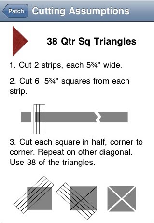 There are numerous ways for quilters to cut patches and blocks. BlockFab computes fabric needs based on using strips. Tap on the cutting assumptions for a particular unit to see further hints on how to cut the strips.